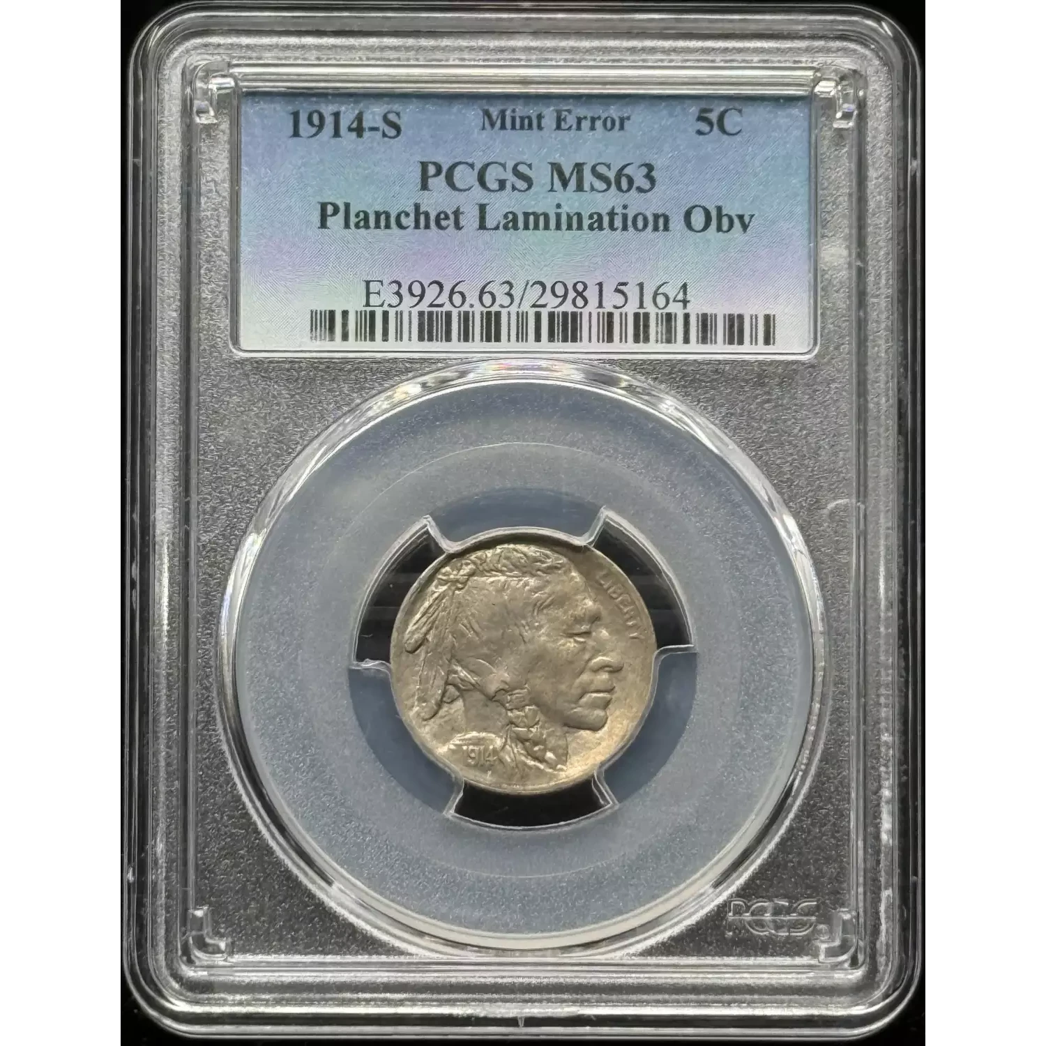 1914-S Nickel Indian Head or Buffalo PCGS MS-63 Planchet Lamination Obverse