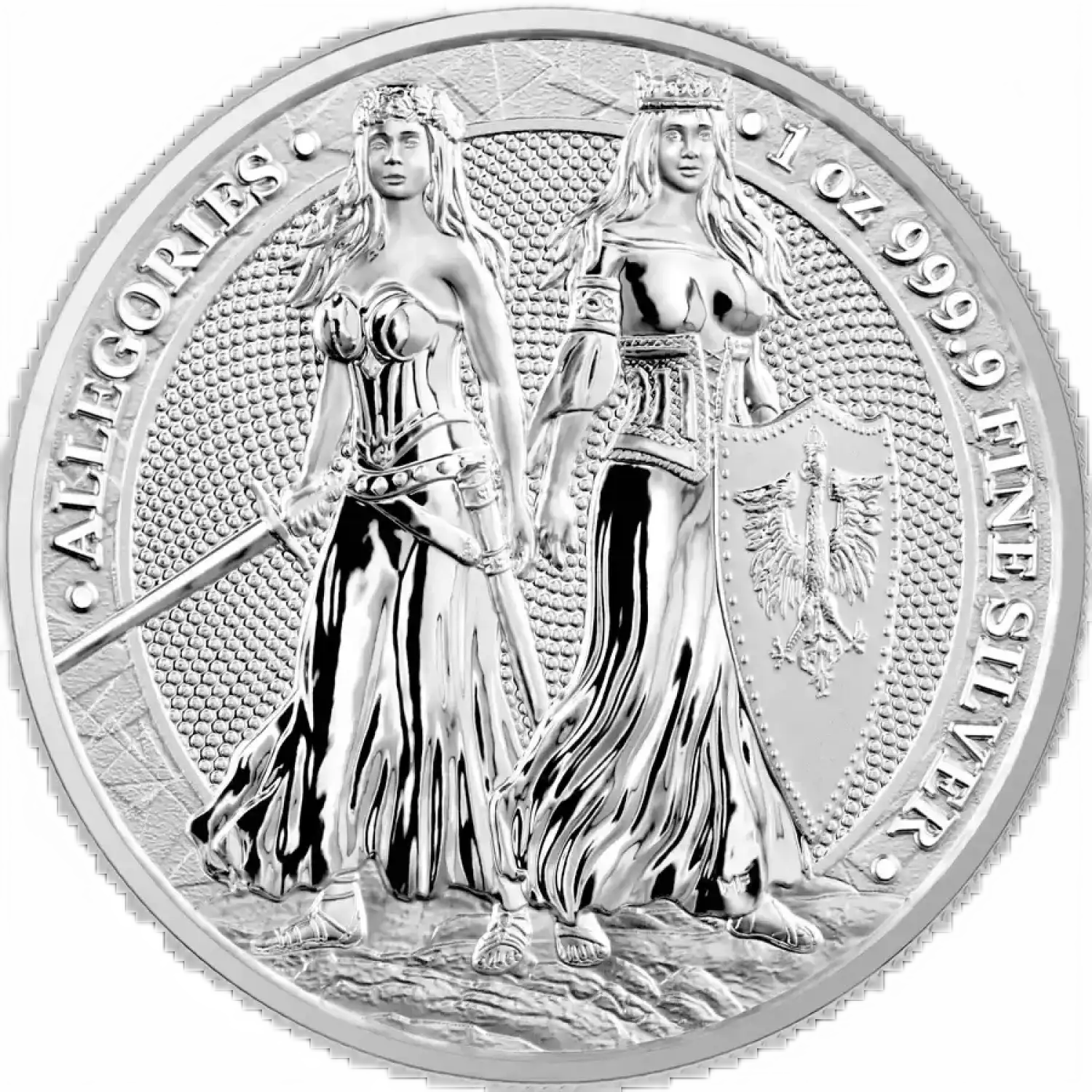 Polonia and Germania is the fifth coin from Germania Mint’s Allegories, coming to Collectors in 2022. The whole series depicts personifications of countries around the world in a form of beautiful, sensual and strong women. The Allegories coins are created in one diameter of 38.61 mm and four different heights and weights, from 3 mm for the 1 oz coin to 25.85 mm for 10 oz coin, which is exceptional not only because of its thickness the blanks, from which it has been minted, were processed manually.