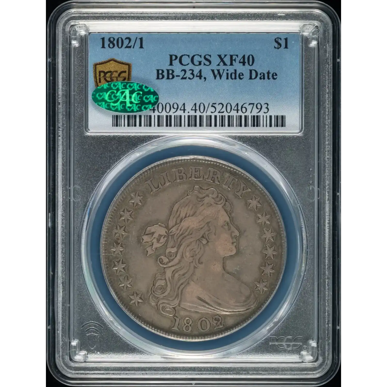 1802 Silver Dollars Draped Bust PCGS XF-40 1802/1 BB-234, Wide Date CAC